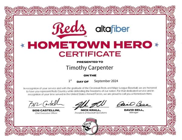 Lawrence County Veterans Service Office is proud to announce that our very own, Tim Carpenter, was honored at the Cincinnati Reds Great American Ball Park on September 1, 2024 as the Hometown Hero.